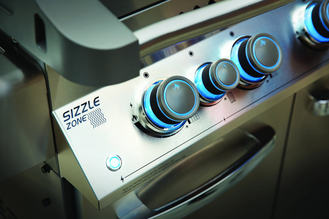Each control knob glows red when active and blue when off, helping you grill safely at night or in low-light conditions.
