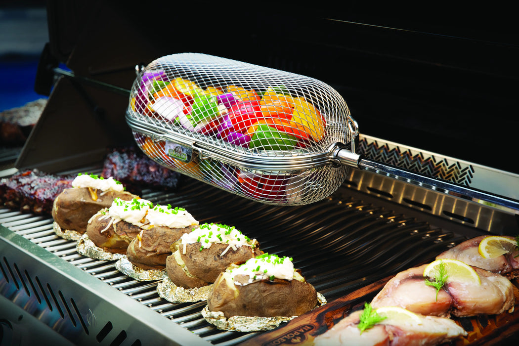 Rear infrared rotisserie burner + included heavy-duty rotisserie kit