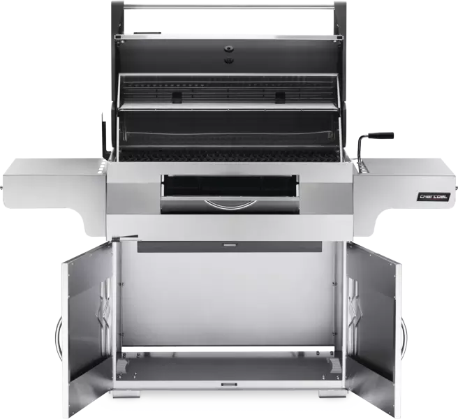 Soft-close stainless doors conceal generous storage space for charcoal and accessories. Heavy-duty casters offer maneuverability and stability.